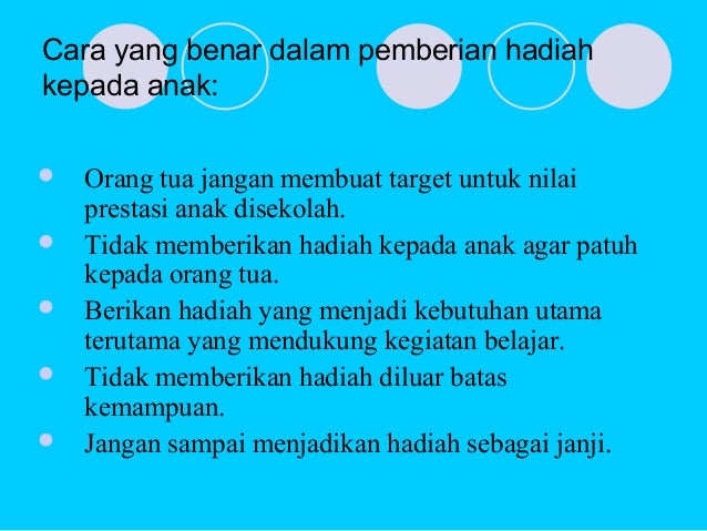 Contoh, Anda mampu membagikan Mama bangga sama adek, tadi adek sudah mau menyebarkan mainan dengan sahabat waktu di sekolah. Biasanya ucapan kebanggaan ini lebih efektif daripada Anda murka dan menghukum anak ketika ia nir mau menyebarkan mainan. Jangan lupa puji dengan ungkap-ungkap khusus atas sikap baik yg sudah anak lakukan.